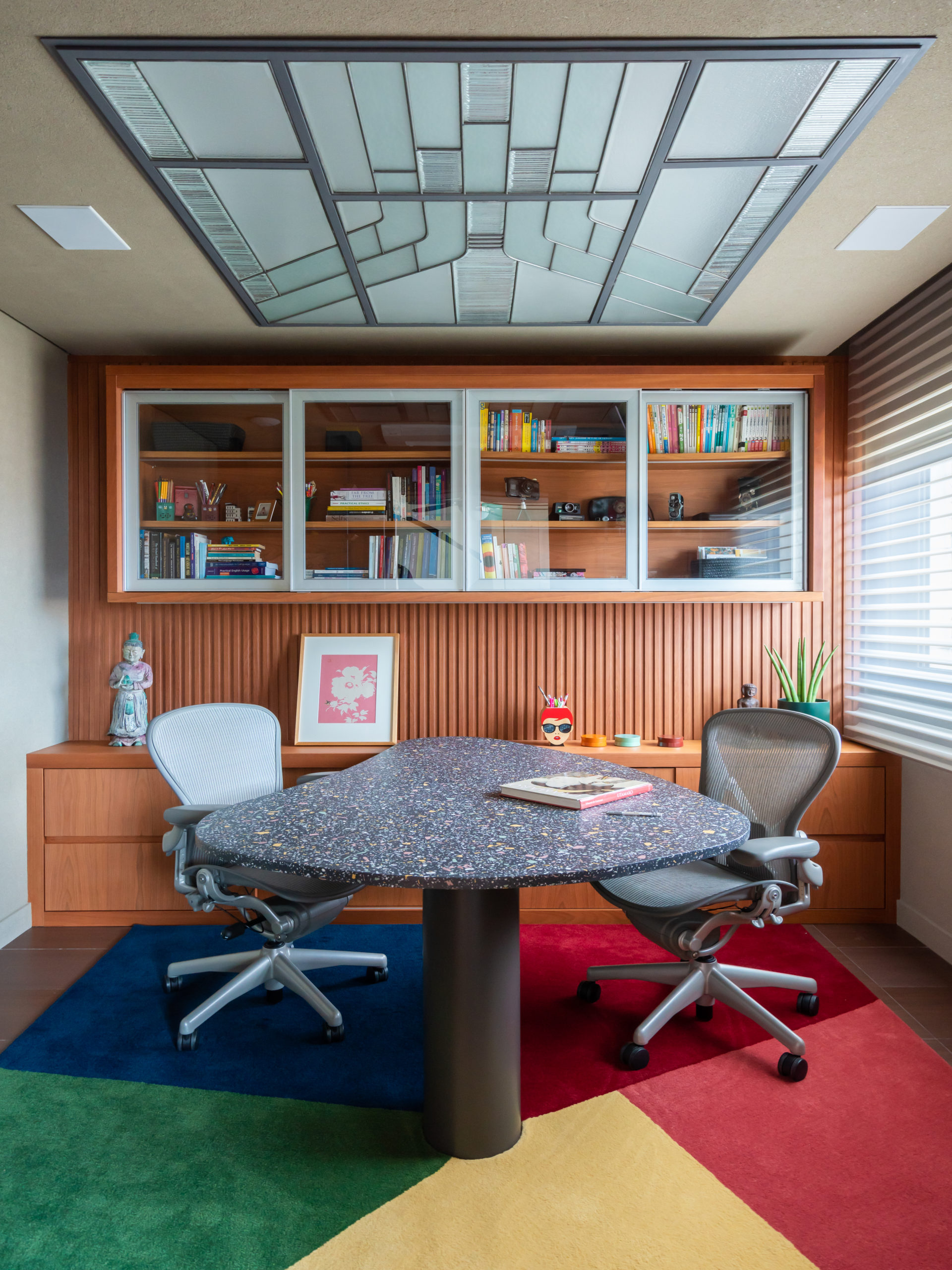 O home office é aquele canto da casa onde se mistura trabalho, estudo e lazer. Madeira, uso de cores e texturas também se fazem presente aqui. O tapete geométrico com cores vibrantes, a mesa em granilite com formato orgânico e pequenos grânulos coloridos compondo com a base cimentícia grafite – todas as peças desenhadas por nós, são o charme do ambiente. O belíssimo vitral foi mantido com fitas de led muito bem dimensionadas para luz difusa uniforme.