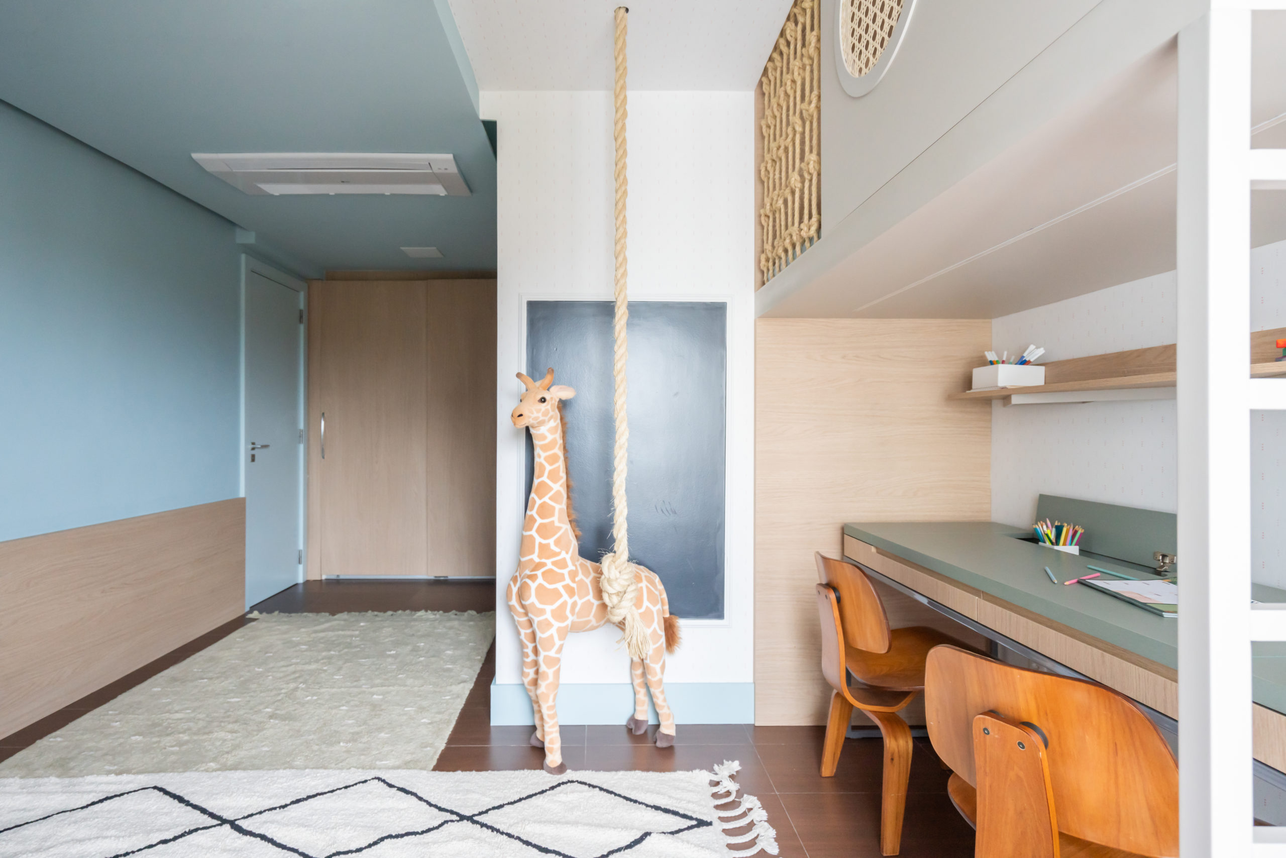 Na brinquedoteca, o esquema de cores verde, azul, cinza e rosa em tom pastel ditam o ambiente. Referências do estilo nórdico foram trazidos ao projeto, móveis funcionais, peças em madeira clara, estrutura metálica e corda naval, deixam o espaço livre para circulação.